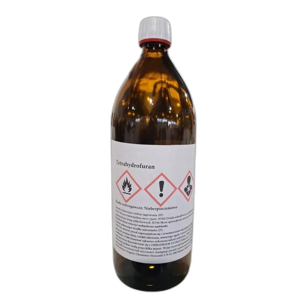 Tetrahydrofuran (C₄H₈O) to bezbarwny płyn używany jako rozpuszczalnik w laboratoriach. Czystość 99%, pojemność 1000 ml.